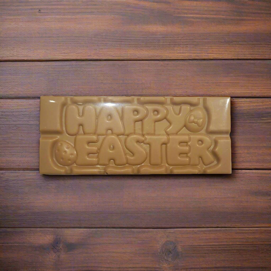 Sweet, creamy, and full of festive cheer! Our White Caramel Happy Easter Bar features a smooth white caramel chocolate flavour. The “Happy Easter” message is embossed on the bar, making it a delightful gift for any Easter celebration.